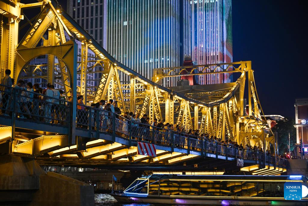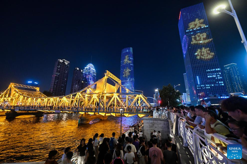 People enjoy the night view on Jiefang Bridge over the Haihe River in north China's Tianjin, Aug. 11, 2025. Light installations and illuminated landmark buildings along the river together present a dazzling cityscape for citizens and tourists. (Xinhua/Zhao Zishuo)