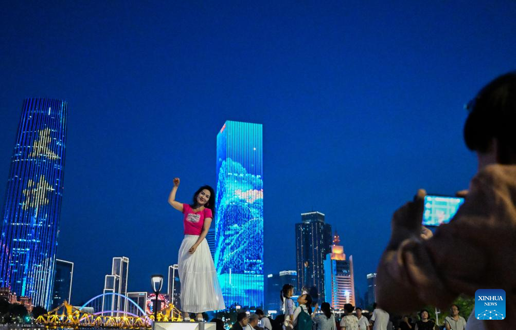 A tourist poses for photos by the Haihe River in north China's Tianjin, Aug. 11, 2025. Light installations and illuminated landmark buildings along the river together present a dazzling cityscape for citizens and tourists. (Xinhua/Zhao Zishuo)