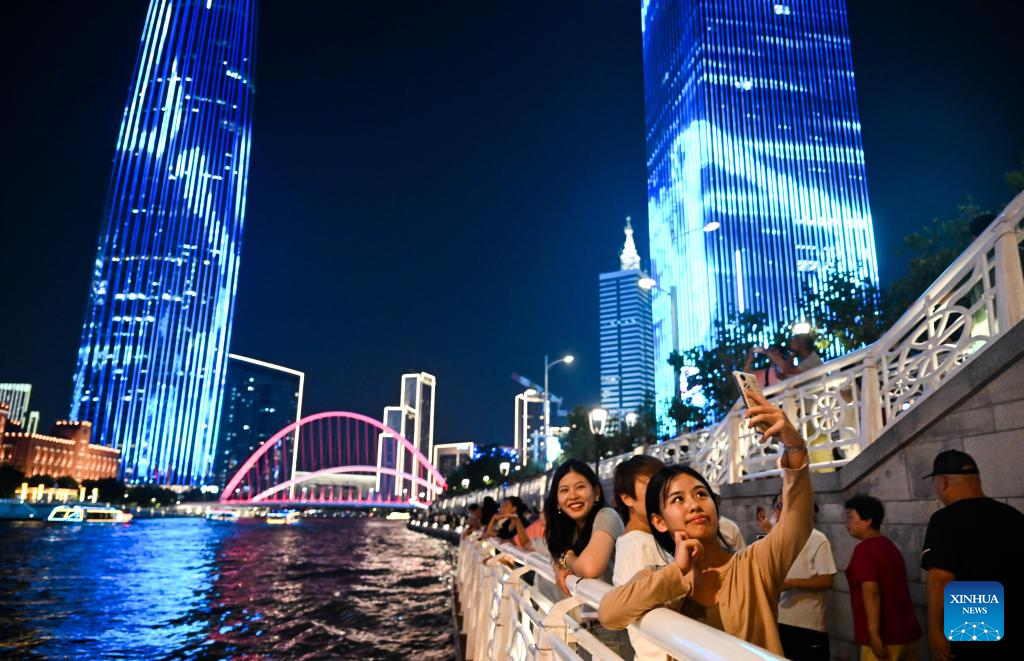 Tourists take selfies by the Haihe River in north China's Tianjin, Aug. 11, 2025. Light installations and illuminated landmark buildings along the river together present a dazzling cityscape for citizens and tourists. (Xinhua/Zhao Zishuo)