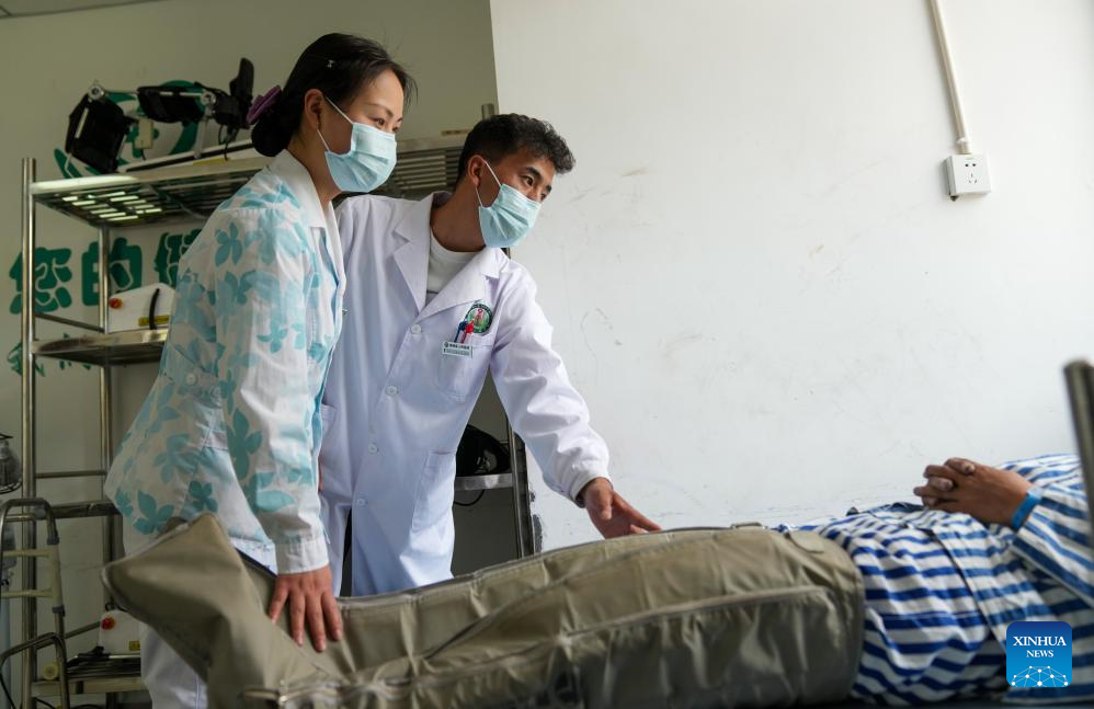 A doctor and a nurse provide rehabilitation therapy for a patient at a hospital in Qamdo, southwest China's Xizang Autonomous Region, July 21, 2025. Since 2015, 203 hospitals from 17 provinces and cities nationwide have deployed over 2,000 experts in teams to assist medical institutions in Xizang, training 5,536 local medical staff in the region. (Xinhua/Jigme Dorje)