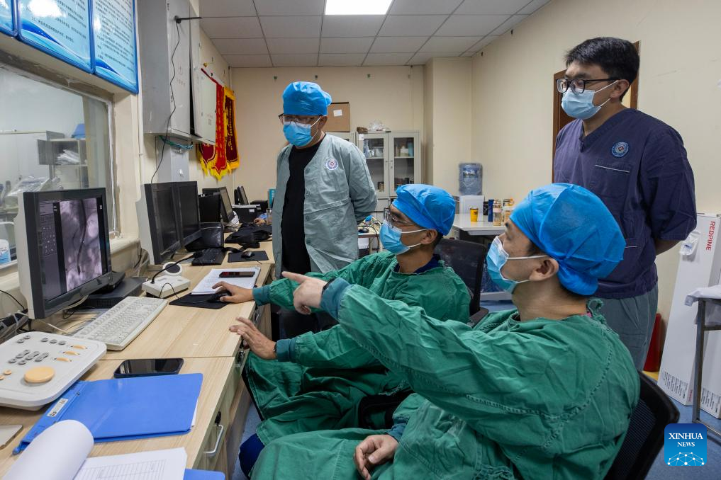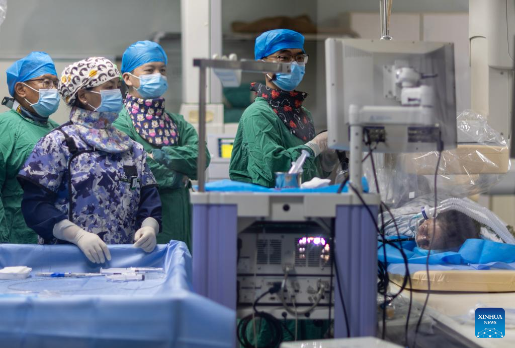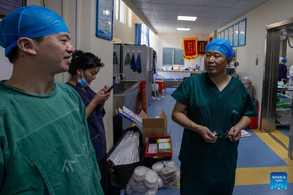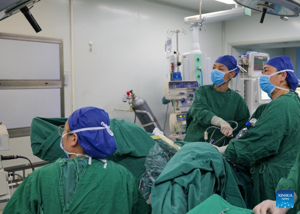 Doctors from Beijing and Lhasa monitor a surgery at a hospital in Lhasa, southwest China's Xizang Autonomous Region, Aug. 5, 2025. Since 2015, 203 hospitals from 17 provinces and cities nationwide have deployed over 2,000 experts in teams to assist medical institutions in Xizang, training 5,536 local medical staff in the region. (Xinhua/Jiang Fan)