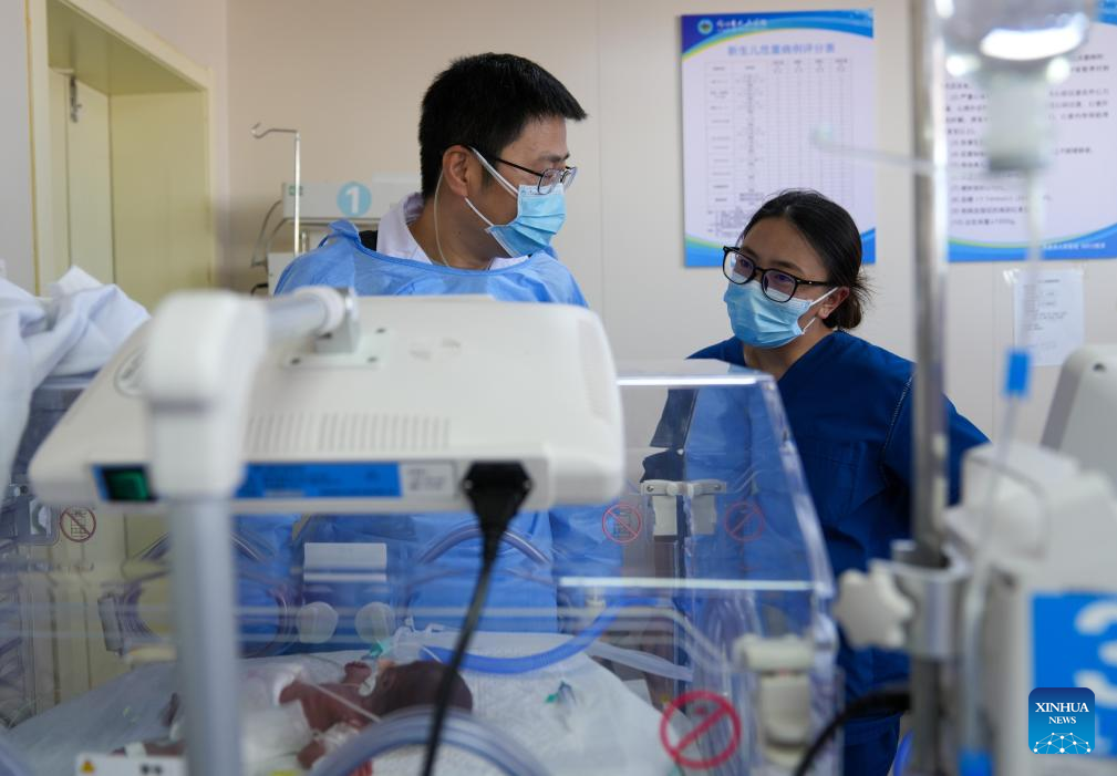 A doctor from Dalian of northeast China's Liaoning Province and a nurse from Nagqu discuss on a patient's condition at a hospital in Nagqu, southwest China's Xizang Autonomous Region, July 18, 2025. Since 2015, 203 hospitals from 17 provinces and cities nationwide have deployed over 2,000 experts in teams to assist medical institutions in Xizang, training 5,536 local medical staff in the region. (Xinhua/Jigme Dorje)