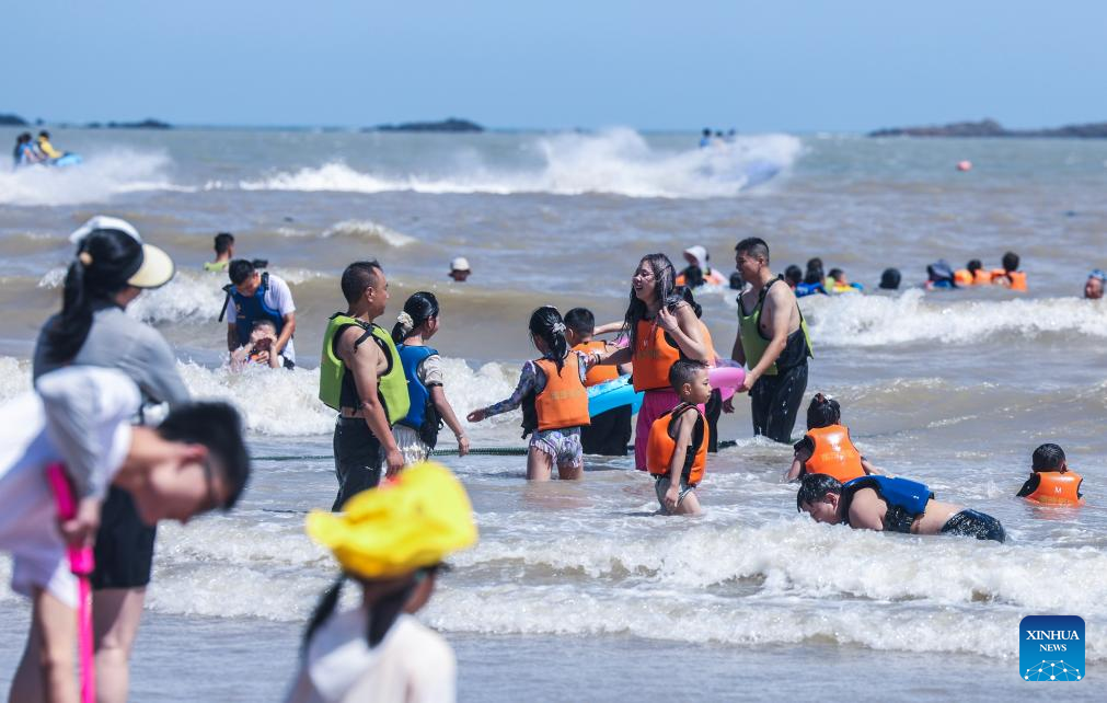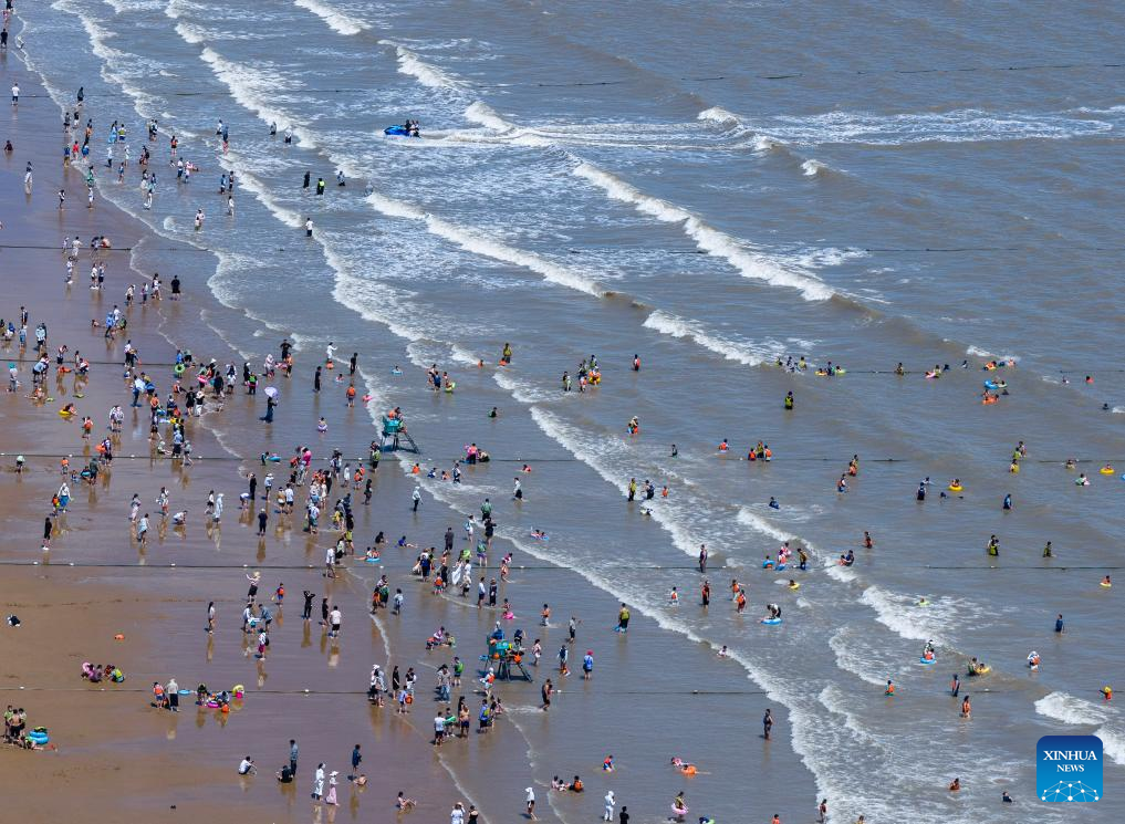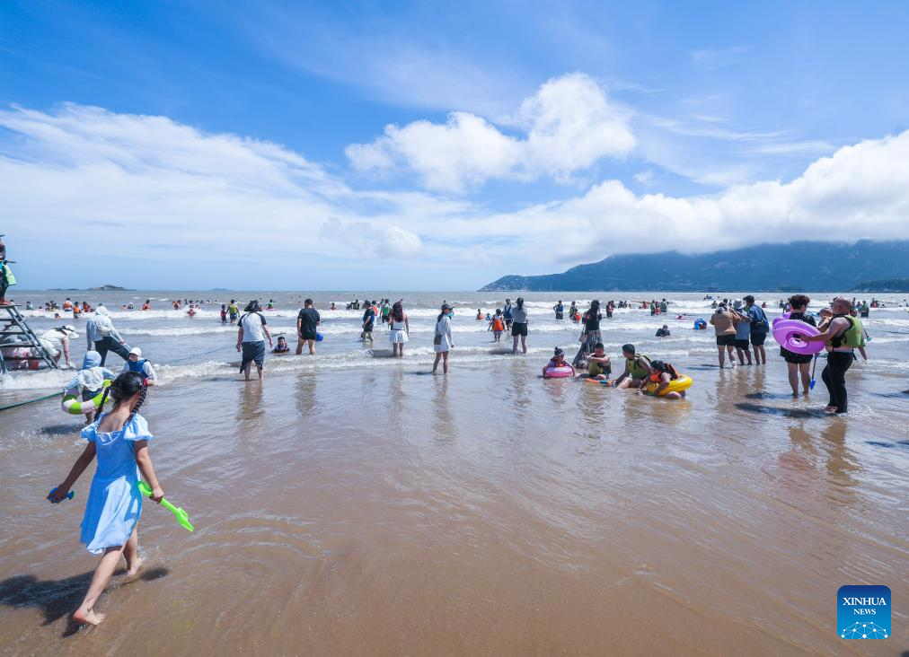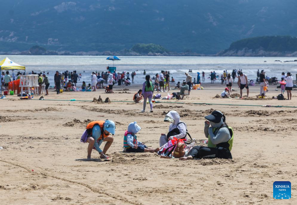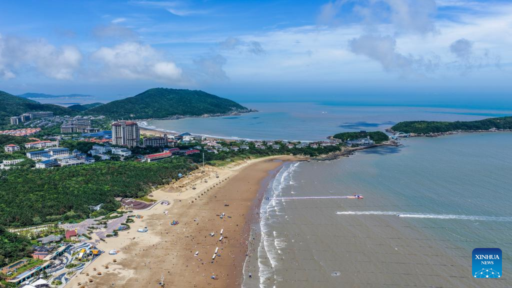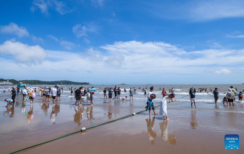 Tourists have fun on a beach at the Nansha scenic area in Zhujiajian, Zhoushan City, east China's Zhejiang Province, on Aug. 12, 2025. As Nansha scenic area ushered in the summer tourism peak, seaside activities like sand sculpture festival, music party, night swimming, sailing and fireworks show attracted tourists from around the country. (Xinhua/Xu Yu)