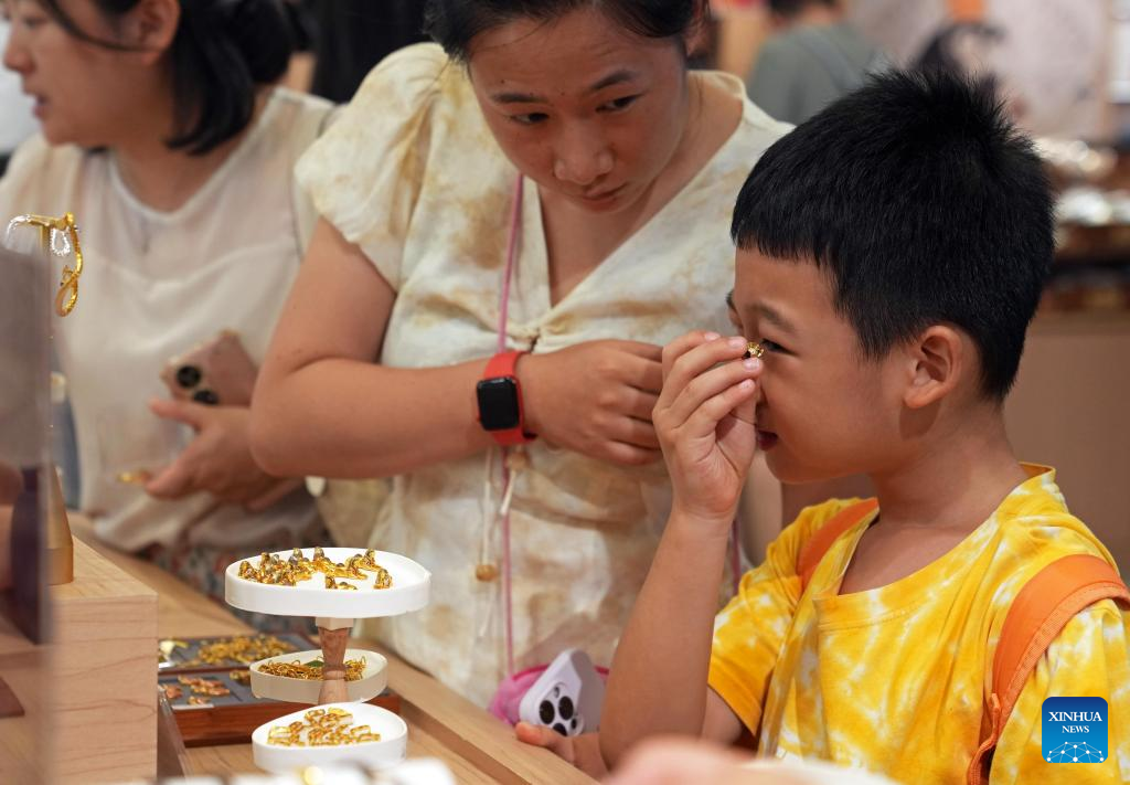 A child selects goods at a cultural and creative product shop at the Shanghai Museum at night in Shanghai, east China, Aug. 11, 2025. The exhibition, titled "On Top of the Pyramid: The Civilization of Ancient Egypt," opens 24 hours a day from Aug. 11 to 17 at the Shanghai Museum. During the 168-hour carnival, there will also be new books releases, Egyptian dancing performances, interactive games and cultural and creative production promotions here. (Xinhua/Liu Ying)