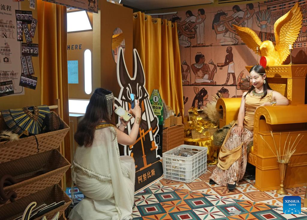 A visitor poses for Egyptian-style photos at a cultural and creative product shop at the Shanghai Museum at night in Shanghai, east China, Aug. 11, 2025. The exhibition, titled "On Top of the Pyramid: The Civilization of Ancient Egypt," opens 24 hours a day from Aug. 11 to 17 at the Shanghai Museum. During the 168-hour carnival, there will also be new books releases, Egyptian dancing performances, interactive games and cultural and creative production promotions here. (Xinhua/Liu Ying)