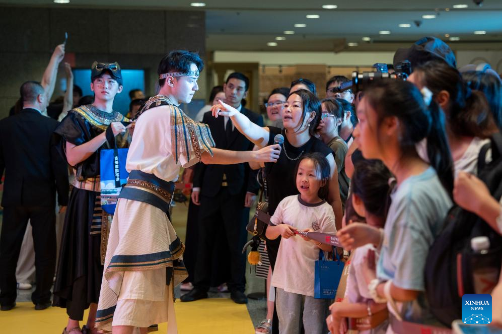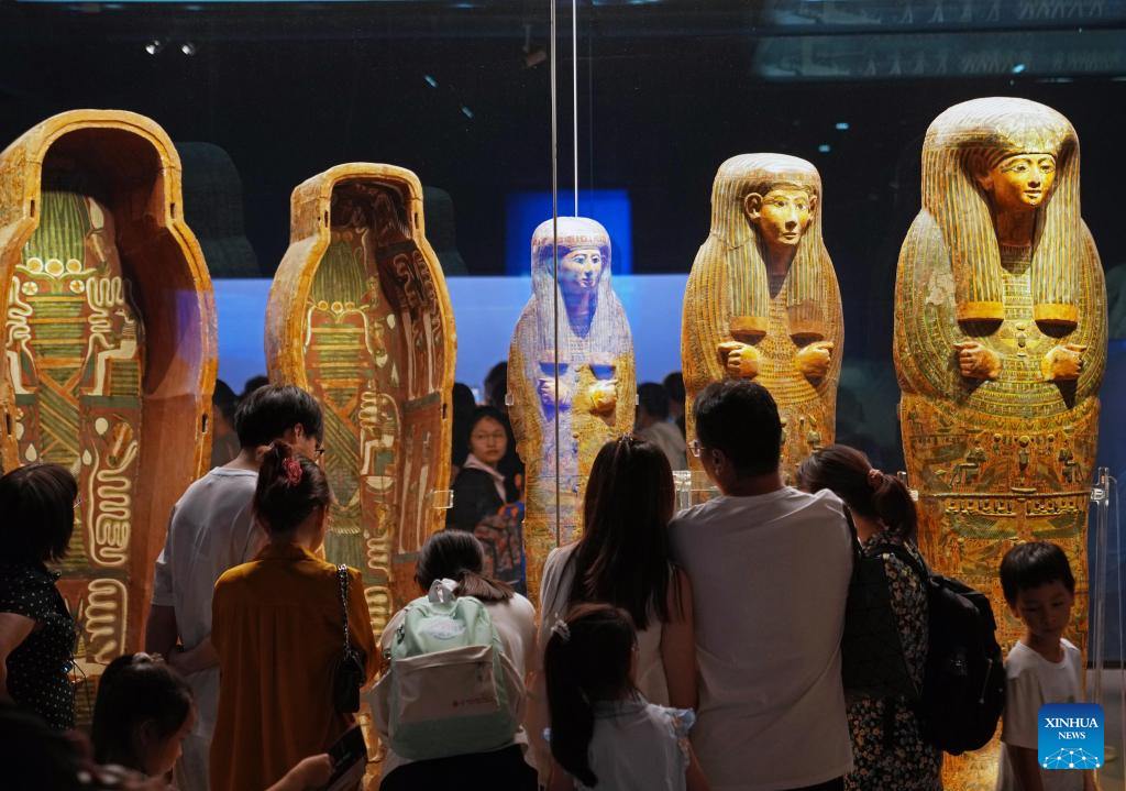 People visit the exhibition "On Top of the Pyramid: The Civilization of Ancient Egypt" at the Shanghai Museum at night in Shanghai, east China, Aug. 11, 2025. The exhibition, titled "On Top of the Pyramid: The Civilization of Ancient Egypt," opens 24 hours a day from Aug. 11 to 17 at the Shanghai Museum. During the 168-hour carnival, there will also be new books releases, Egyptian dancing performances, interactive games and cultural and creative production promotions here. (Xinhua/Liu Ying)