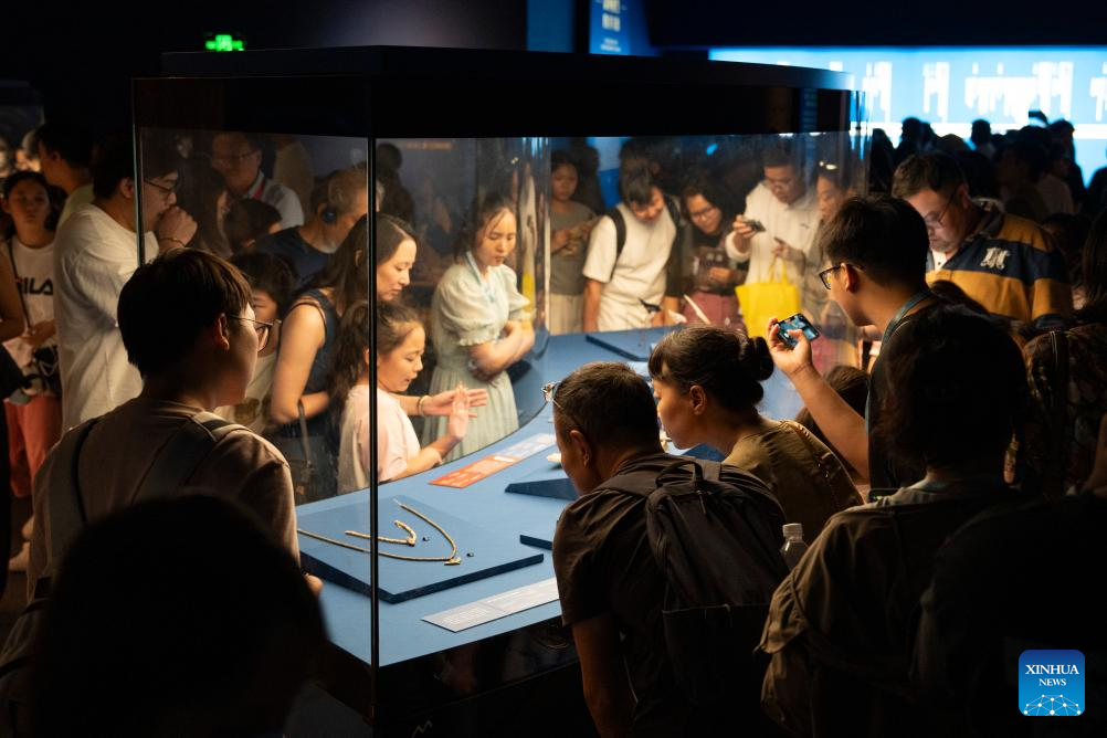 People visit the exhibition "On Top of the Pyramid: The Civilization of Ancient Egypt" at the Shanghai Museum at night in Shanghai, east China, Aug. 11, 2025. The exhibition, titled "On Top of the Pyramid: The Civilization of Ancient Egypt," opens 24 hours a day from Aug. 11 to 17 at the Shanghai Museum. During the 168-hour carnival, there will also be new books releases, Egyptian dancing performances, interactive games and cultural and creative production promotions here. (Photo by Zhang Yue/Xinhua)