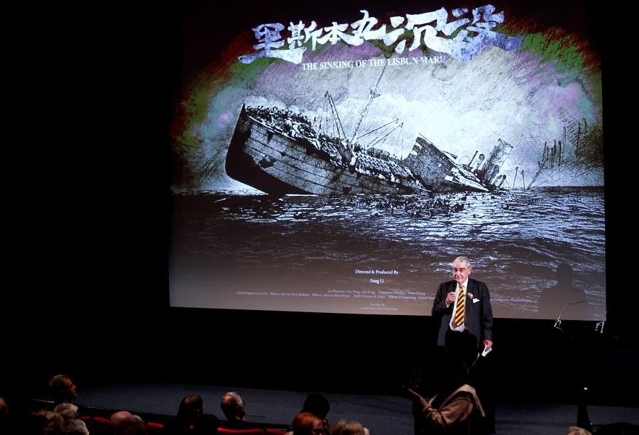 Retired British soldier Brian Finch, who has been committed to collecting historical documents related to the Lisbon Maru, speaks during a special screening of the documentary "The Sinking of the Lisbon Maru" in London, Britain, Aug. 15, 2023. (Xinhua/Li Ying)