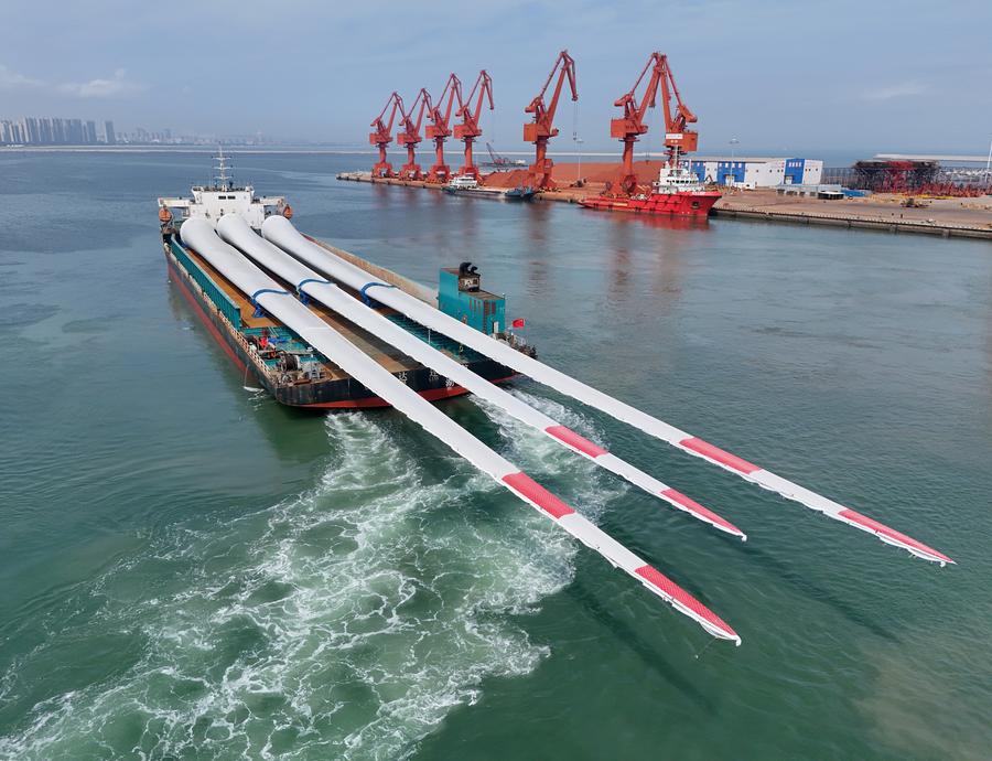 An aerial drone photo taken on Aug. 1, 2025 shows oversized offshore wind turbine blades being transported from Yantai Port in east China's Shandong Province. (Photo by Tang Ke/Xinhua)