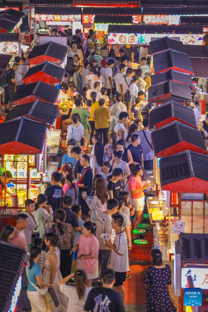People visit a night market in Qingdao, east China's Shandong Province, Aug. 12, 2025. People enjoy their summer time by travelling around the country. (Photo by Zhang Ying/Xinhua)