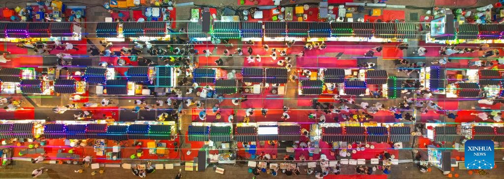 An aerial drone photo taken on Aug. 12, 2025 shows a night market in Qingdao, east China's Shandong Province. People enjoy their summer time by travelling around the country. (Photo by Zhang Ying/Xinhua)