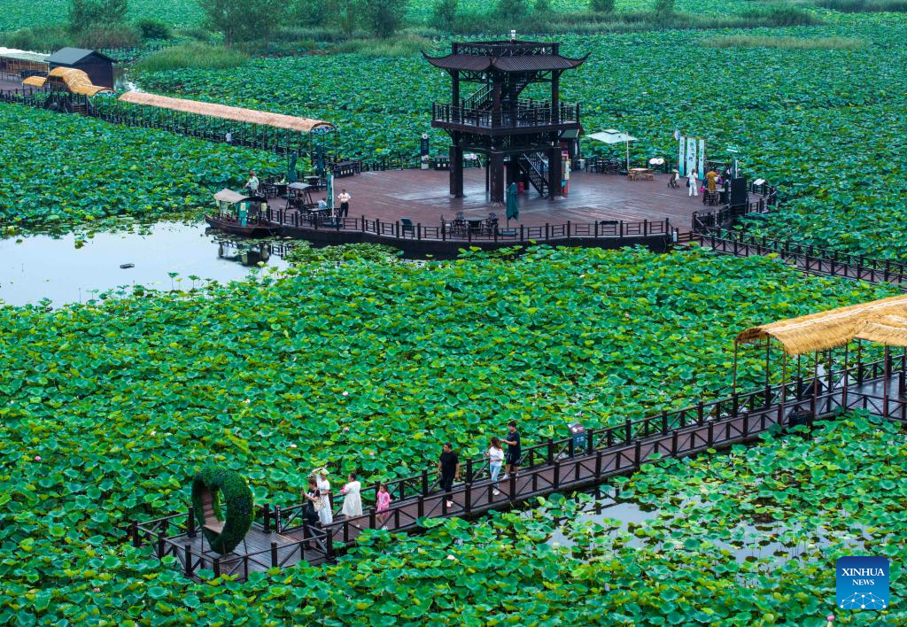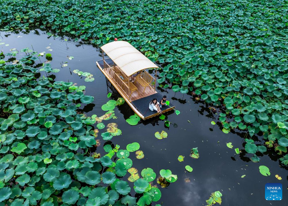 An aerial drone photo taken on Aug. 13, 2025 shows a view of a lotus pond scenic area in Xinghua City, east China's Jiangsu Province. People enjoy their summer time by travelling around the country. (Photo by Zhou Shegen/Xinhua)