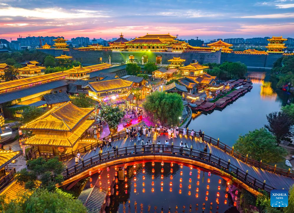 An aerial drone photo taken on Aug. 11, 2025 shows the Tangcheng scenic spot in Xiangyang City, central China's Hubei Province. People enjoy their summer time by travelling around the country. (Photo by Yang Dong/Xinhua)