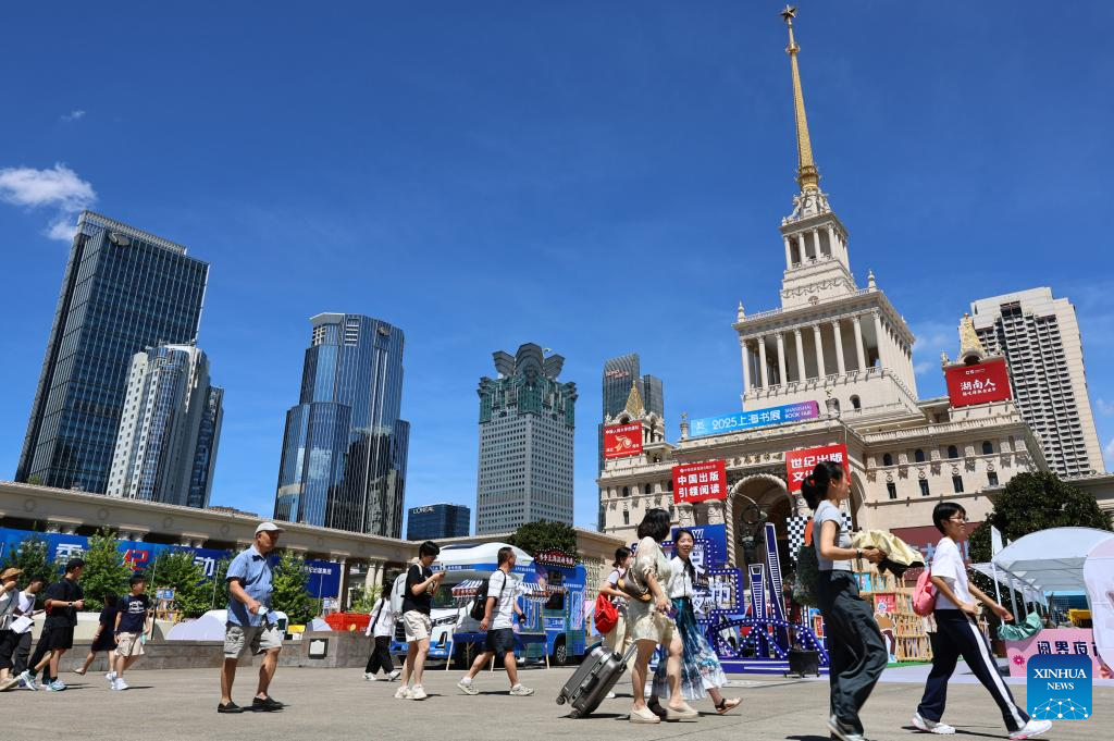 People walk into the venue of the 2025 Shanghai Book Fair in Shanghai, east China, Aug. 13, 2025. The book fair kicked off on Wednesday and will last until Aug. 19. (Xinhua/Fang Zhe)