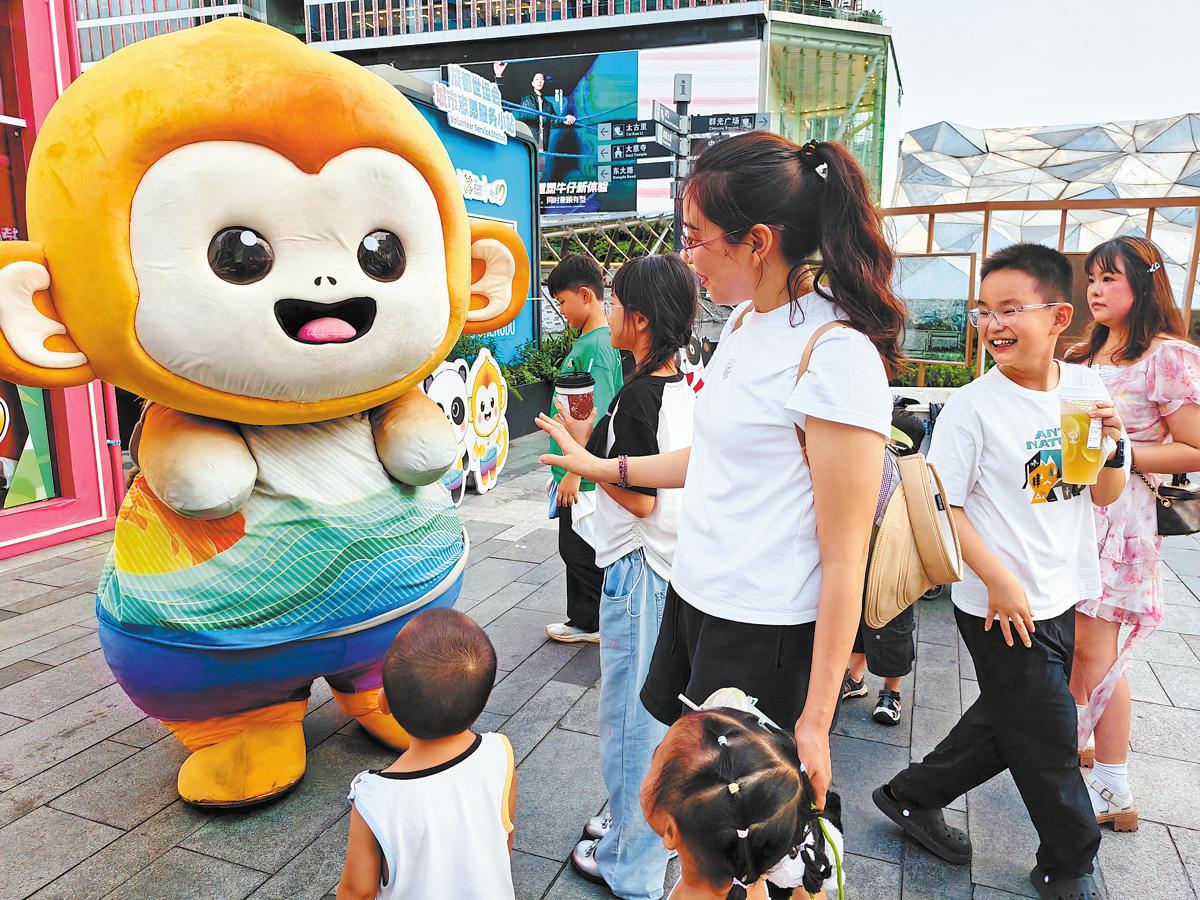 Visitors interact with Jin Zai, one of the two mascots of the 12th World Games, on Tuesday in front of a licensed merchandise store for the ongoing games in Chengdu, Sichuan Province. Peng Chao / China Daily