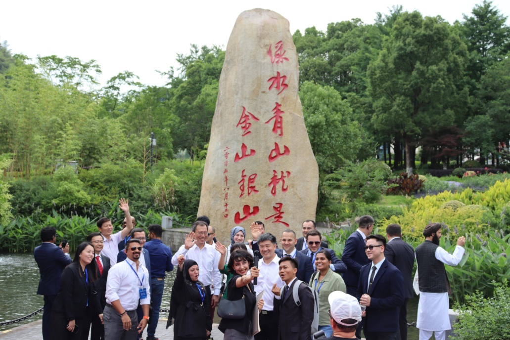 Participants from member states of the Shanghai Cooperation Organization (SCO) join the "Road to Common Prosperity" study tour in Yucun village, Anji county, Huzhou city, east China's Zhejiang province, in June 2025. (People's Daily/Li Anqi)