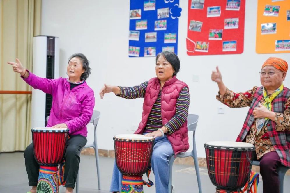 Senior residents play drums at an elderly care facility in Kaiyuan, southwest China's Yunnan province. (Photo from the WeChat official account of Pengyang Elderly Care)
