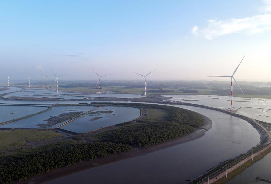 An aerial drone photo taken on Oct. 30, 2023 shows wind turbines of Cox's Bazar wind power project built by a Chinese company in Bangladesh. (Photo by Salim/Xinhua)