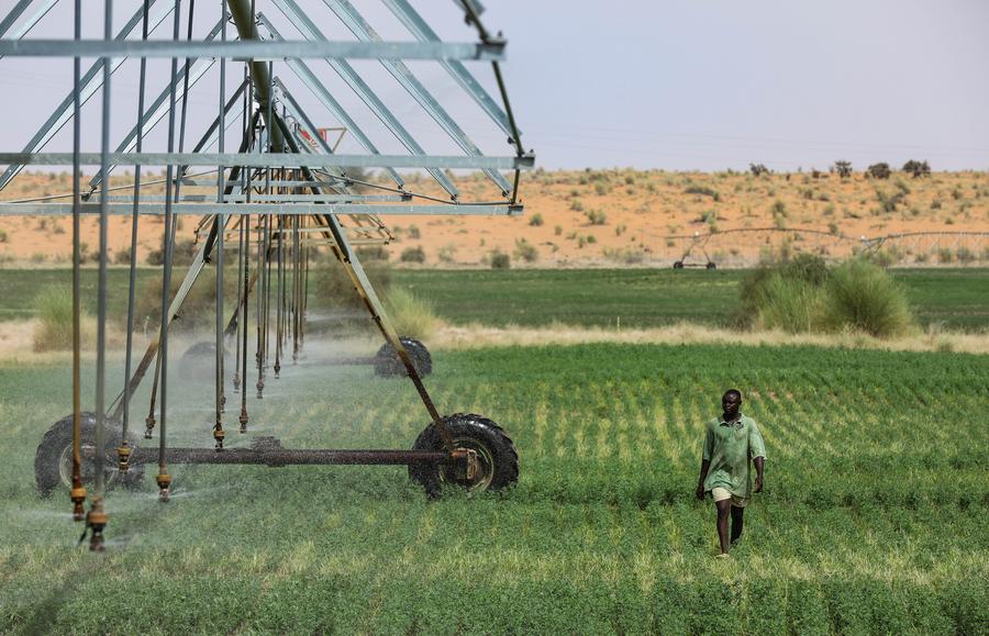 A herder checks the operation of a center-pivot irrigation system in an alfalfa field at the Livestock Demonstration Center in Idini village, Mauritania, July 18, 2025. (Xinhua/Han Xu)