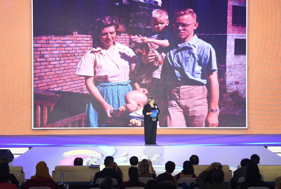 Elyn MacInnis gives a speech on her family's bond with Kuliang at the 4th Maritime Silk Road (Fuzhou) International Tourism Festival in Fuzhou, southeast China's Fujian Province, Nov. 30, 2018. (Xinhua/Lin Shanchuan)