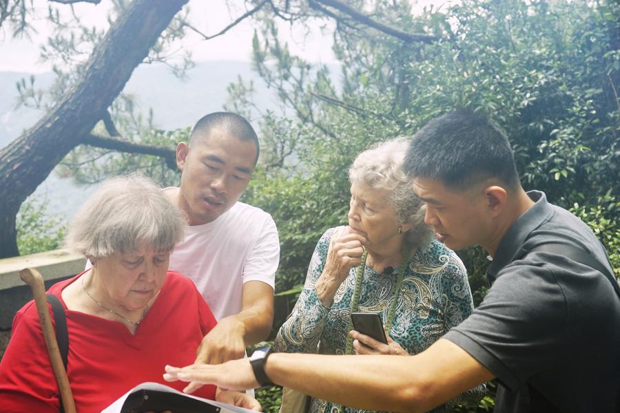 Elyn MacInnis (1st L) reads an old map of Kuliang, now a hillside resort, in Fuzhou, southeast China's Fujian Province, June 24, 2023. (Xinhua)