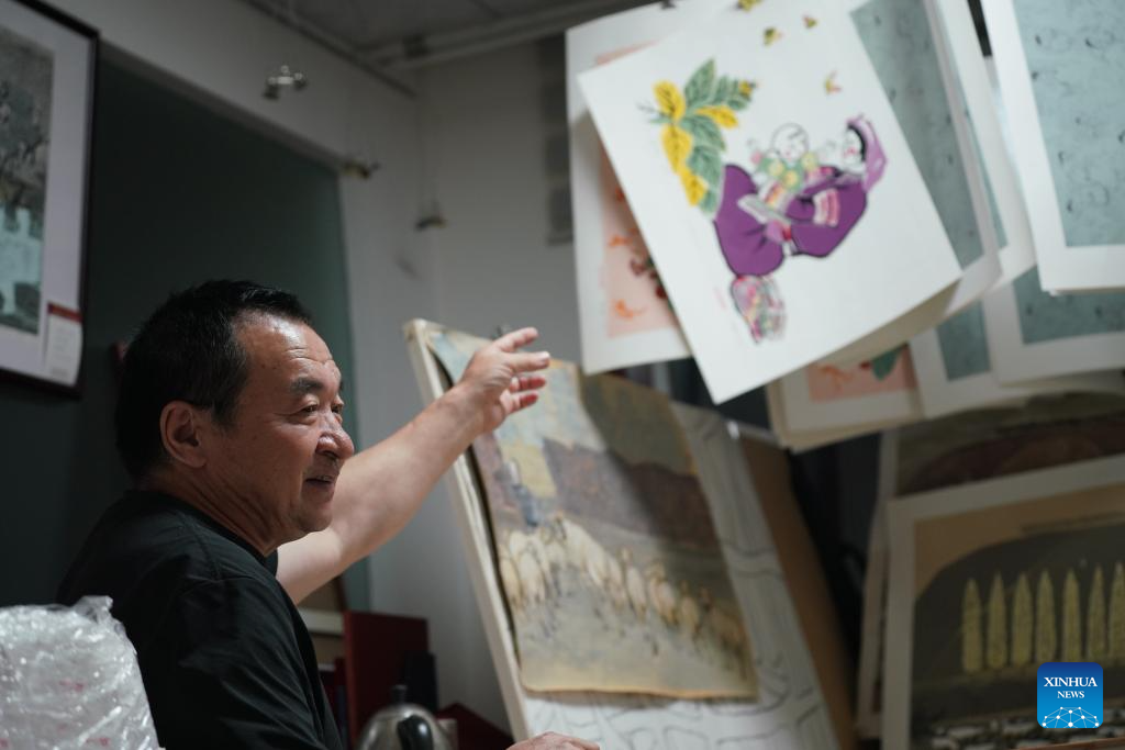 Painter Qi Tongyue introduces his artworks at a woodblock painting institute in Jarud Banner, north China's Inner Mongolia Autonomous Region, Aug. 10, 2025. (Xinhua/Liu Wenhui)