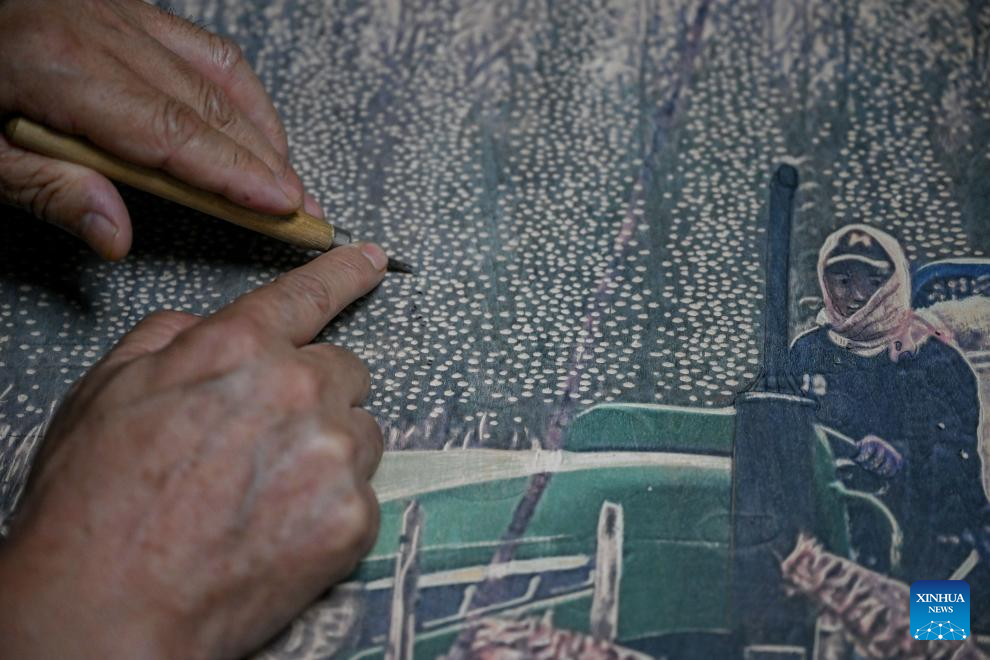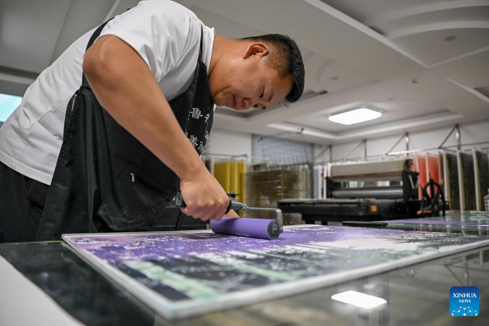Painter Qi Tongyue creates a Jarud woodblock painting at a woodblock painting institute in Jarud Banner, north China's Inner Mongolia Autonomous Region, Aug. 10, 2025. (Xinhua/Liu Wenhui)