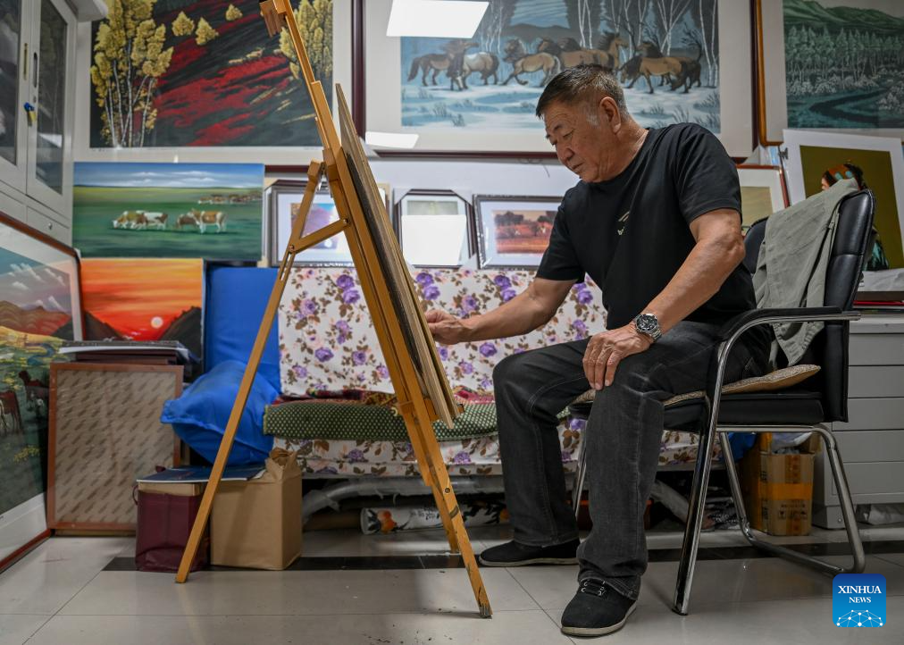 Zhaun Namur, a representative inheritor of Jarud woodblock painting art, shows one of his artworks at a woodblock painting institute in Jarud Banner, north China's Inner Mongolia Autonomous Region, Aug. 10, 2025. The creation of a Jarud woodblock painting work, which originated in Jarud Banner in the late 1950s, has to go through more than a dozen steps, finished with engraving knife, woodblock and ink.