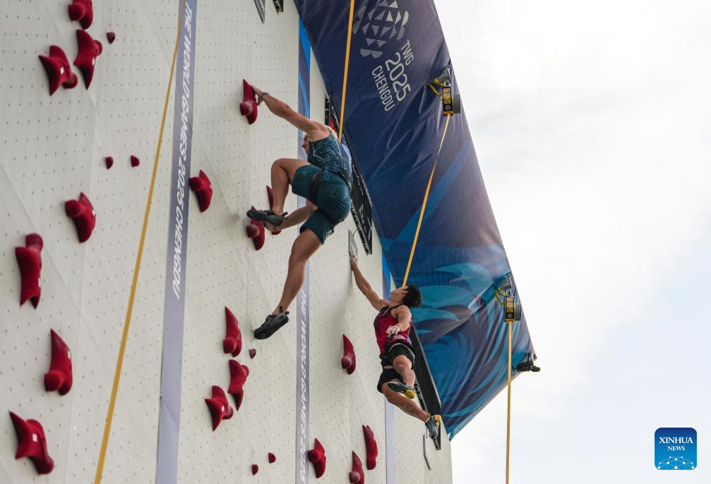 Long Jianguo (R) of China and Ludovico Fossali of Italy compete during the Sport Climbing Men's Speed Single Semifinal at The World Games 2025 in Chengdu, southwest China's Sichuan Province, Aug. 14, 2025. (Xinhua/Tenzin Nyida)