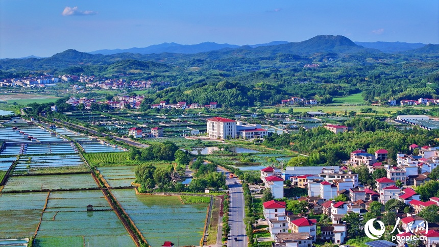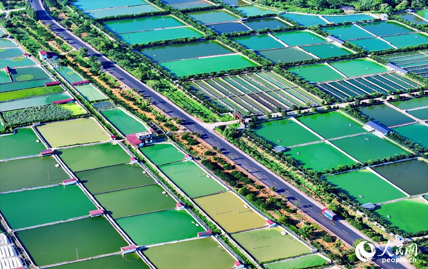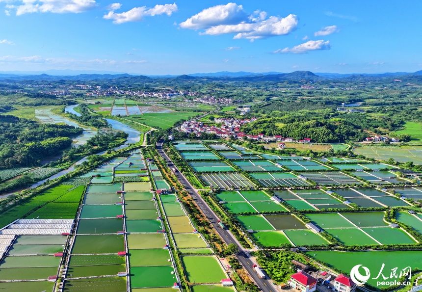 Recently, aquaculture farms have been built scattered along rural highways in Nanfeng county of Fuzhou city, east China's Jiangxi Province. Combined with farm houses, rice fields and green mountains, the farms reflect a blaze of colors and create a brand-new landscape of ecological industries.