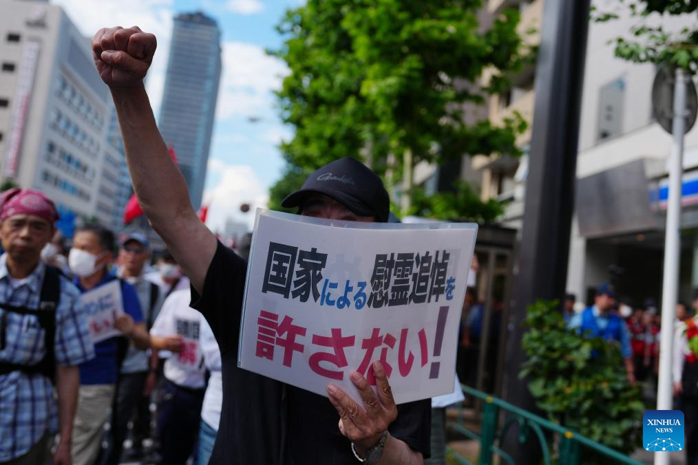 Participants are pictured during a demonstration on a street of Tokyo, Japan, on Aug. 15, 2025. Japanese Prime Minister Shigeru Ishiba on Friday expressed "remorse" in his speech at the annual memorial ceremony for the war dead, as the country marked the 80th anniversary of its unconditional surrender in World War II, but the "remorse" was not on Japan's responsibility for aggression against Asian countries.(Xinhua/Jia Haocheng)