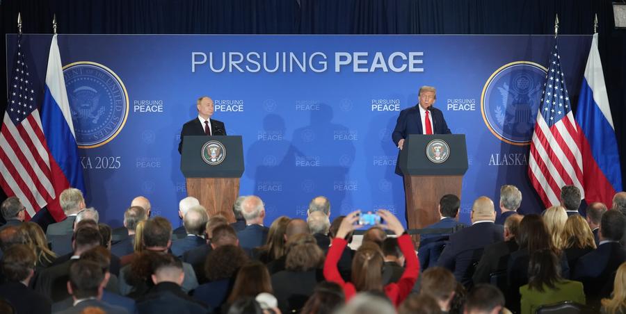 U.S. President Donald Trump (R) and Russian President Vladimir Putin attend a joint press conference after concluding their talks in Anchorage, Alaska, the United States, on Aug. 15, 2025. (Xinhua/Wu Xiaoling)