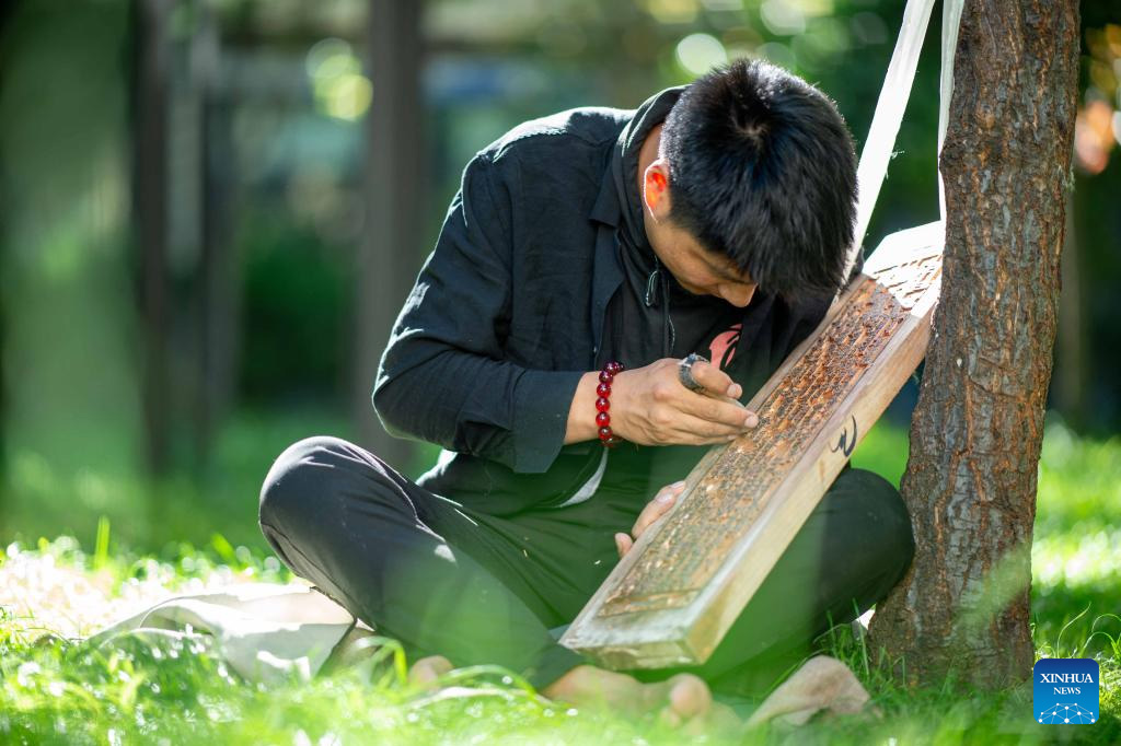 A carver with Tibetan woodblock art, a regional intangible cultural heritage, works in Lhasa, southwest China's Xizang Autonomous Region, Aug. 6, 2025.
