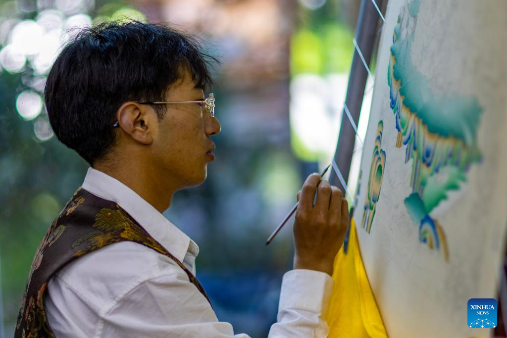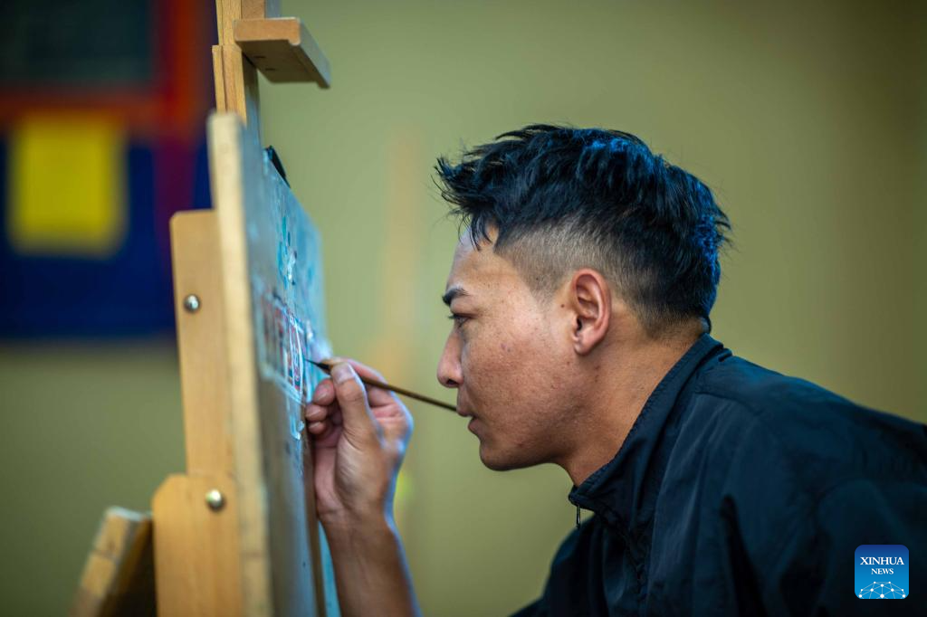 A painter creates a Tibetan Thangka painting, a national intangible cultural heritage, in Lhasa, southwest China's Xizang Autonomous Region, Aug. 6, 2025.