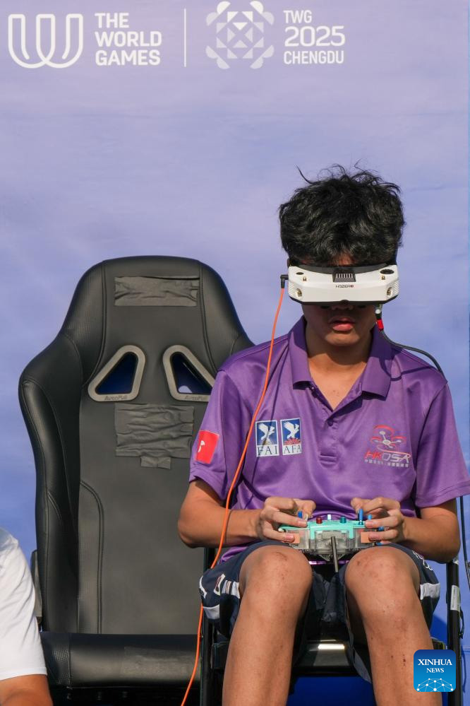 Kwan Chun Yan of China's Hong Kong competes during the Drone Sports Drone Racing at The World Games 2025 in Chengdu, southwest China's Sichuan Province, Aug. 15, 2025. (Xinhua/Li Bo)