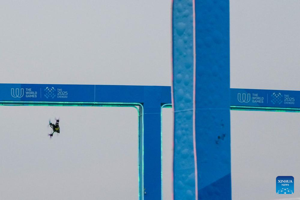 A drone is seen during the Drone Sports Drone Racing at The World Games 2025 in Chengdu, southwest China's Sichuan Province, Aug. 15, 2025. (Xinhua/Li Bo)