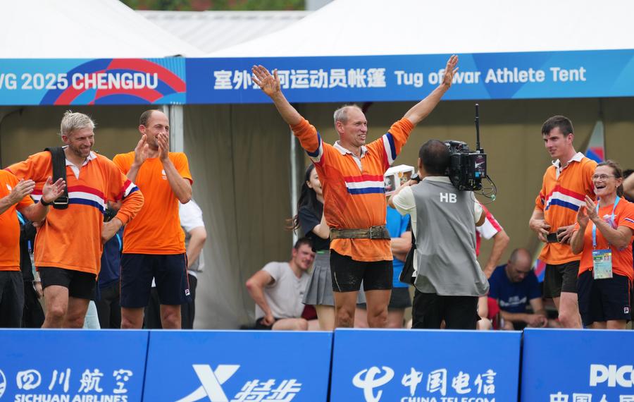 Vincent Wagenmans (C) of the Netherlands celebrates his birthday after the men's outdoor 640kg preliminary round of tug of war, Aug. 9, 2025. (Xinhua/Li Bo)