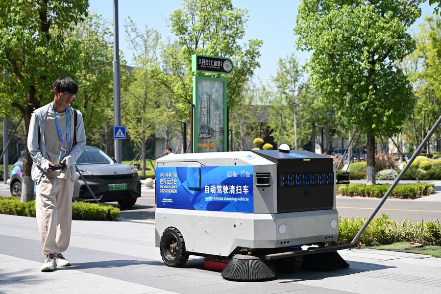 A staff operates an autonomous cleaning vehicle in the World Games Village, Aug. 3, 2025. (Xinhua/Xu Bingjie)