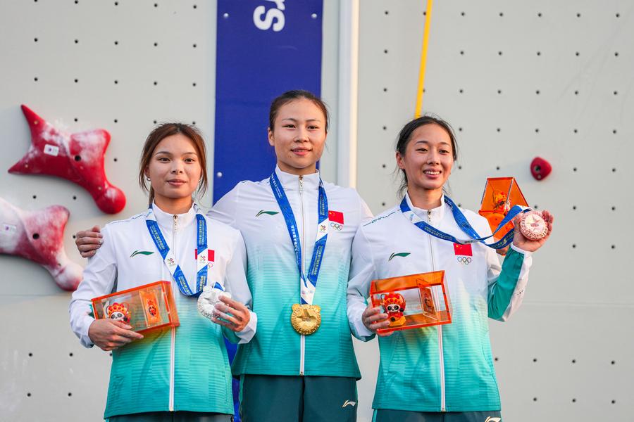 Team China secures a podium sweep in the sport climbing women's speed single at The World Games 2025, Aug. 14, 2025. (Xinhua/Tenzin Nyida)