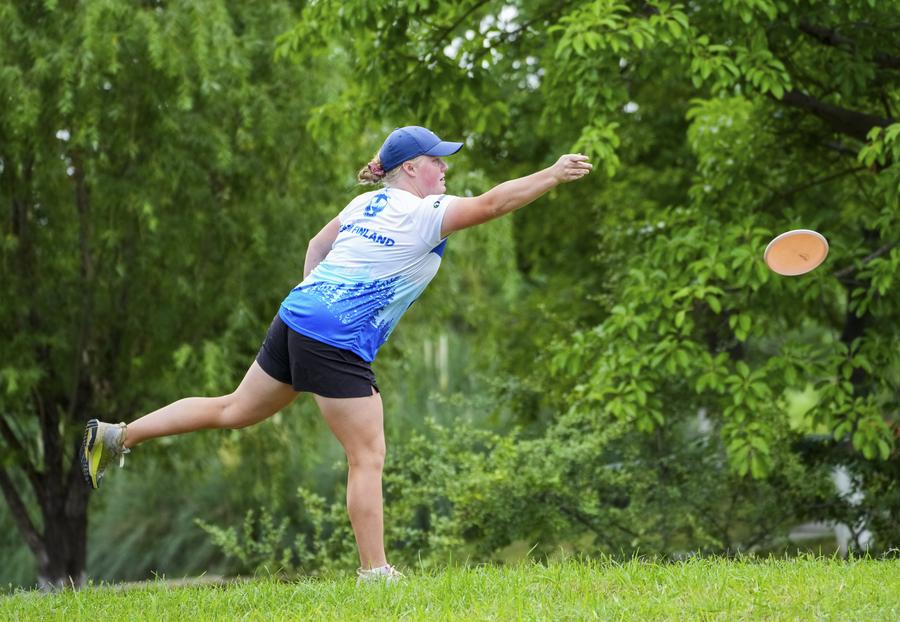 Evelina Salonen of Finland in action during the disc gold mixed doubles semifinals at the Guixi Park, Aug. 9, 2025. (Xinhua/Chen Xinbo)