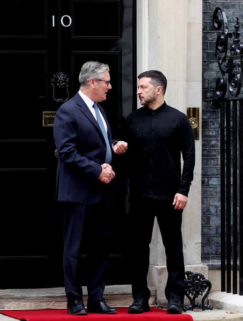 British Prime Minister Keir Starmer (L) shakes hands with Ukrainian President Volodymyr Zelensky at 10 Downing Street in London, Britain, on Aug. 14, 2025.(Xinhua/Li Ying)