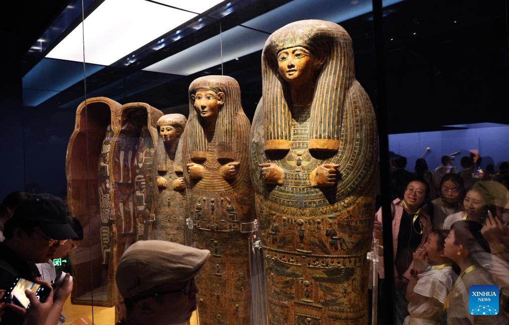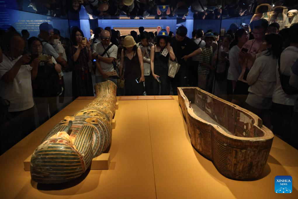 Visitors watch exhibits at Shanghai Museum in Shanghai, east China, Aug. 17, 2025. The exhibition titled "On Top of the Pyramid: The Civilization of Ancient Egypt", which had lasted for 13 months at Shanghai Museum since July 19, 2024, closed on Sunday here, receiving over 2.77 million visitors. (Xinhua/Fang Zhe)