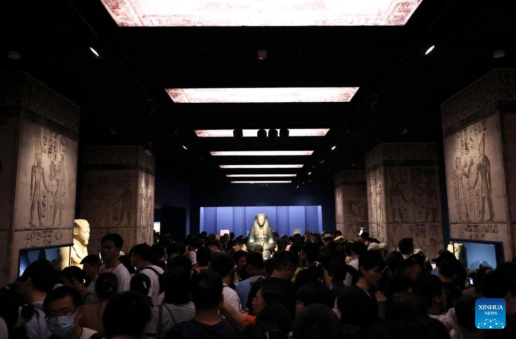 Visitors are seen at an exhibition hall of Shanghai Museum in Shanghai, east China, Aug. 17, 2025. The exhibition titled "On Top of the Pyramid: The Civilization of Ancient Egypt", which had lasted for 13 months at Shanghai Museum since July 19, 2024, closed on Sunday here, receiving over 2.77 million visitors. (Xinhua/Fang Zhe)