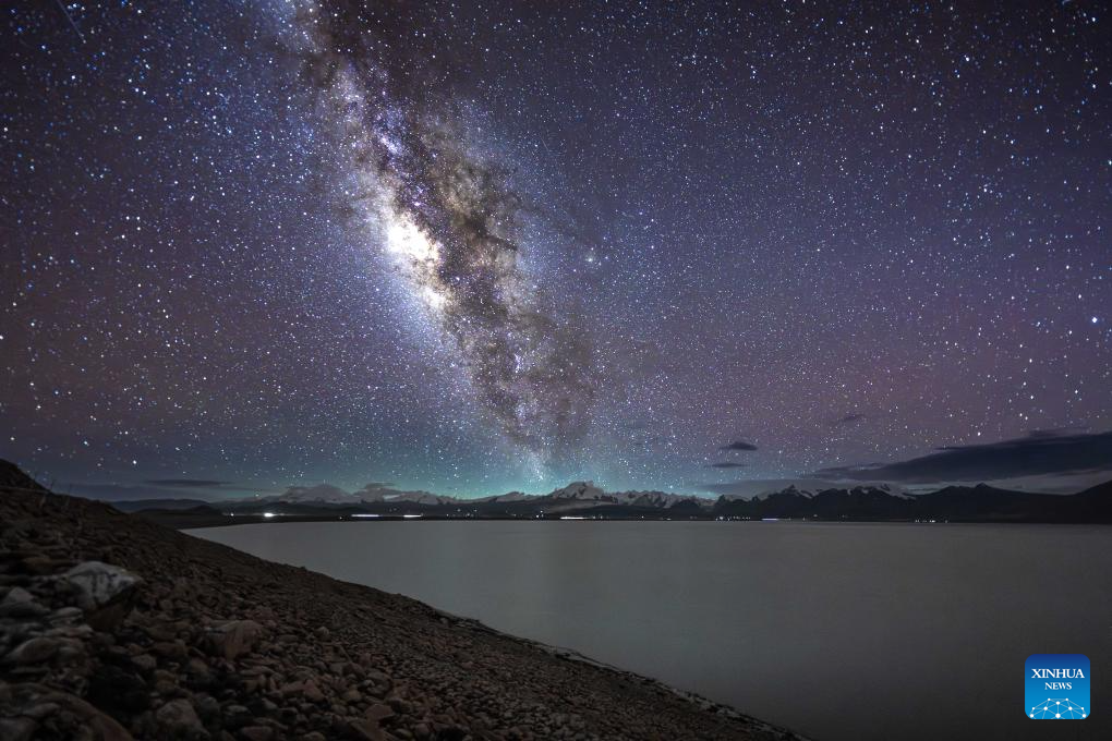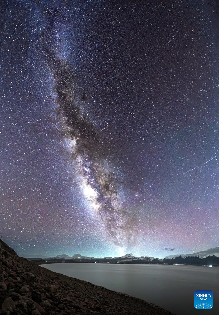 This photo taken on Aug. 14, 2025 shows the Milky Way and a meteor shower above Baiku Co in Xigaze City, southwest China's Xizang Autonomous Region.