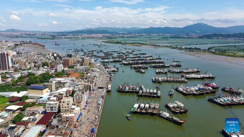 A drone photo taken on Aug. 16, 2025 shows a view of the Bohe fishing port in Maoming City, south China's Guangdong Province. Fishing boats set sail on Saturday after the summer fishing ban lifted in South China Sea. (Xinhua/Xiao Ennan)