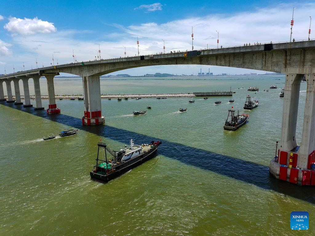 A drone photo taken on Aug. 16, 2025 shows fishing boats departing for fishing across Bohewan bridge in Maoming City, south China's Guangdong Province. Fishing boats set sail on Saturday after the summer fishing ban lifted in South China Sea. (Xinhua/Xiao Ennan)