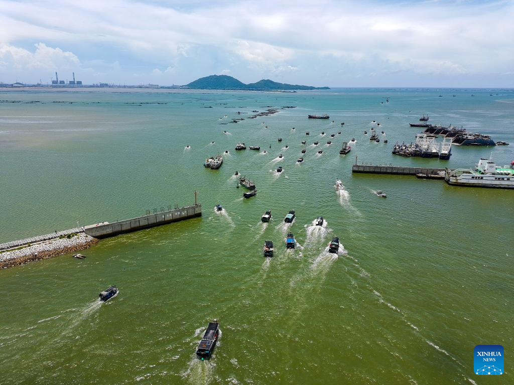 A drone photo taken on Aug. 16, 2025 shows fishing boats departing for fishing from the Bohe fishing port in Maoming City, south China's Guangdong Province. Fishing boats set sail on Saturday after the summer fishing ban lifted in South China Sea. (Xinhua/Xiao Ennan)