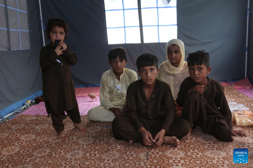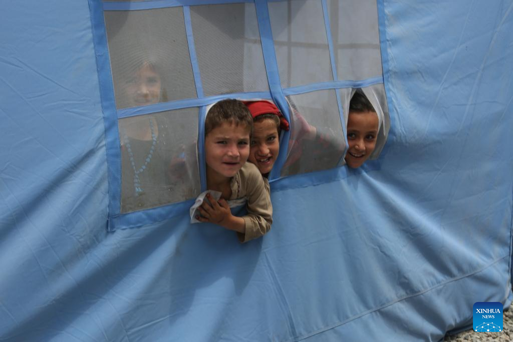 Afghan children are seen inside a China-donated tent at a refugee camp in Kabul, Afghanistan, on Aug. 17, 2025. Across Afghanistan, stories of returnees and students alike paint a picture of resilience and renewal -- a process strengthened by China's timely humanitarian aid and far-reaching educational cooperation. (Photo by Saifurahman Safi/Xinhua)