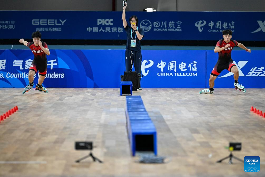 Zhang Hao (L) and Fu Yu (R) of China compete during their Men's Speed Slalom Gold Medal Final of Inline Freestyle Skating event at The World Games 2025 in Chengdu, southwest China's Sichuan Province, Aug. 16, 2025. (Xinhua/Xie Jianfei)