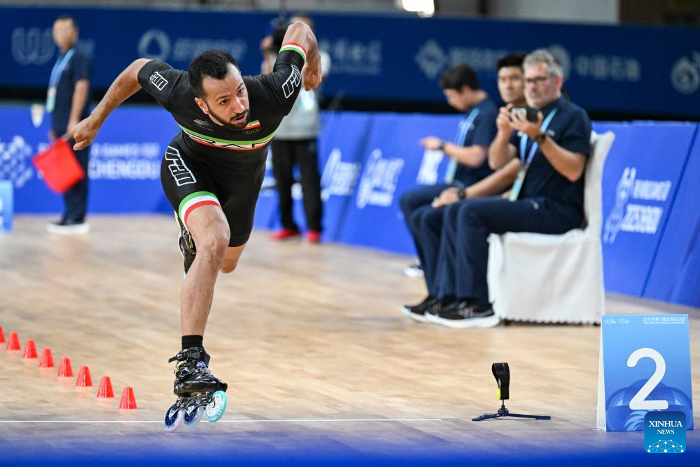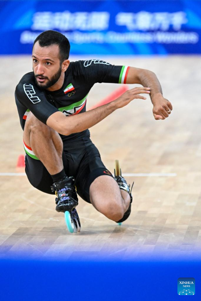 Reza Lesani of Iran competes during the Men's Speed Slalom Bronze Medal Final against Amirmohammad Savari Jamalouei of Iran of Inline Freestyle Skating event at The World Games 2025 in Chengdu, southwest China's Sichuan Province, Aug. 16, 2025. (Xinhua/Xie Jianfei)